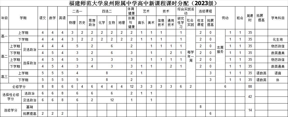 普通高中开设语文、数学、外语、思想政治、历史、地理、物理、化学、生物学、技术(含信息技术和通用技术)、音乐、美术、体育与健康、综合实践活动、劳动等国家课程,以及选修课程(校本课程),具体科目、开设时段、开设模块、课时及学分安排如下: