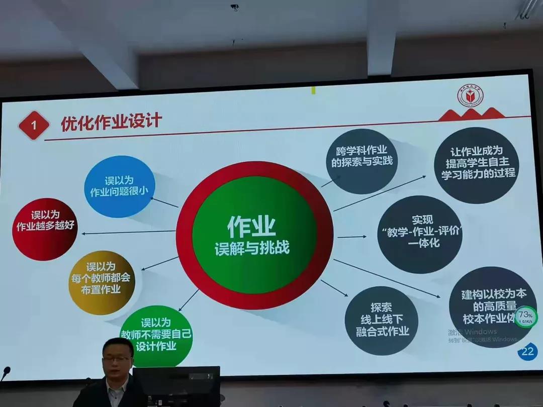 时代中学各学科讲座内容丰富,具有理论的高度和实践的广度。讲座中,各位教学名师结合教学实践分析“双减”政策下“减”与“升”的关系,“减”是减轻校内作业负担和减轻校外培训负担,“升”要做到提升作业管理水平和提升课堂教学质量。减轻学生负担的“三个要点”:即健全作业管理机制,提高作业设计质量,强化作业指导评讲;课堂教学质量有“四个变化”:即专心开展集体备课,细心分析校本学情,精心设计校本教案,用心融入课改理念。打造深度学习的课堂教学质量,着力点应该放在基于学科本质、学科特点,发展学生学科核心素养上。